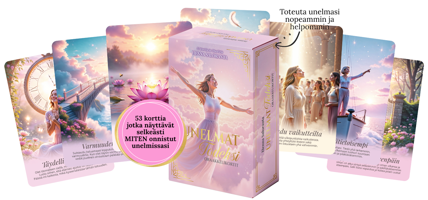 • 2️⃣ Tai hanki koko pakka itsellesi (ja sen mukana erilaiset tavat hyödyntää niitä mm. unelmiesi nopeuttamisessa ja manifestointijumien diagnosoimisessa) ja avaa pääsy elinikäiseen työkaluun, joka tukee sinua jokaisessa unelmassasi.