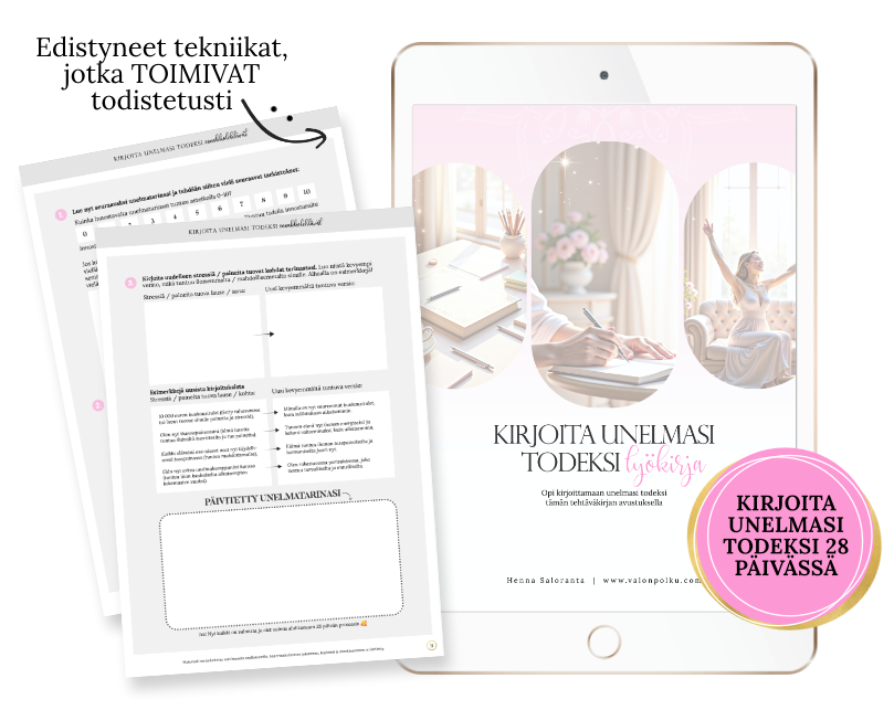 - 🎯 Määrittelet unelmasi korkeimmassa muodossaan – Ei ”ihan ok” -versio. Ei ”realistinen” -versio. Vaan versio, joka saa sydämesi hyppimään.